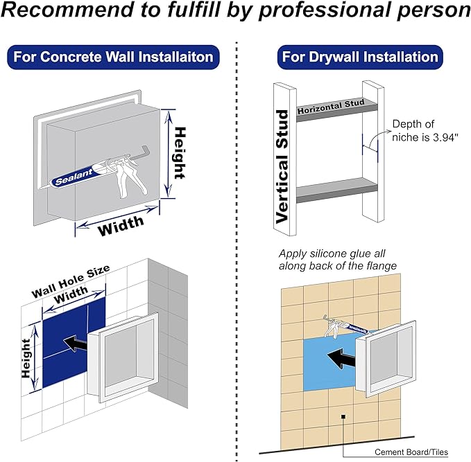 - 【Dimensions】Stainless shower niche white 24" with shelf. Inner size: 12" Width x 24" Height x 3.94" Depth. Vertical niche. White stainless niche flange overlaps finished tiles.
