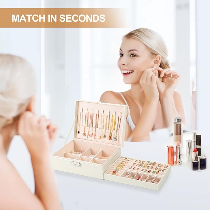 - 【Find the Perfect Match Instantly】: Get your jewelry neatly and beautifully stored in this jewelry boxes organizers. No more messy, damage or misplace. keep your jewelry orderly organized and find your favorite accessories quickly. No more struggling to find where your matching pieces are everyday. Gets your daily dressing up quicker and easier.