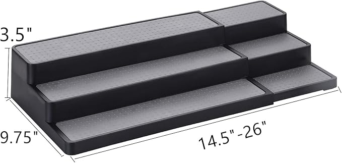 - Expandable Spice Rack: Color: Black,our adjustable spice rack measures 14.5x9.75x3.5 Inch and adjusts from 14.5” to 26” W