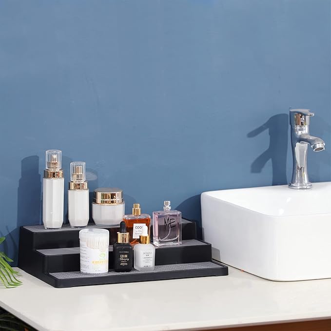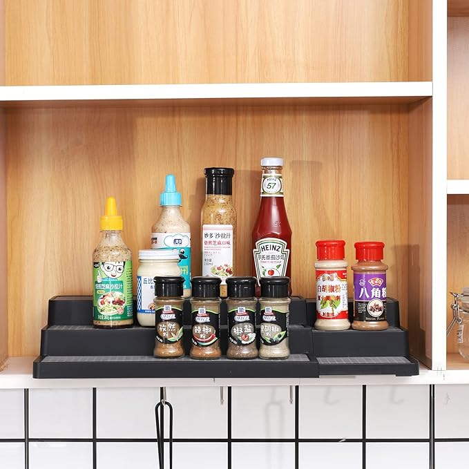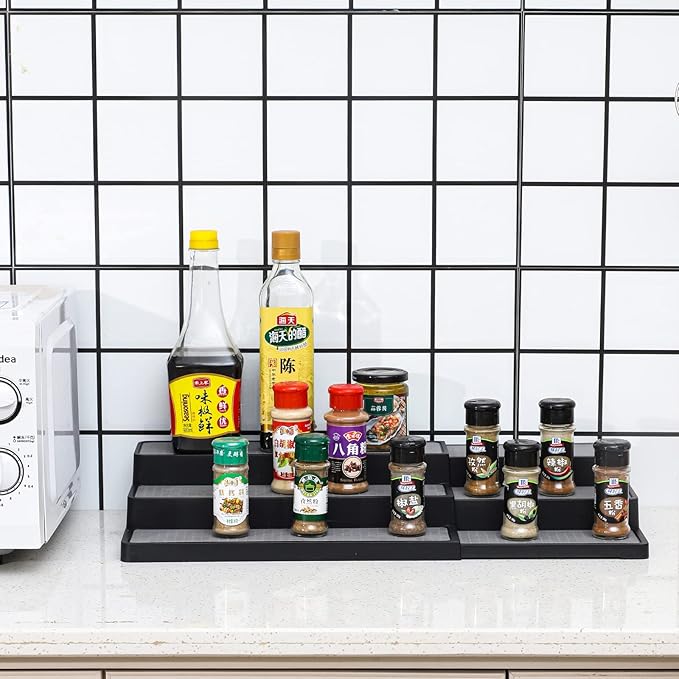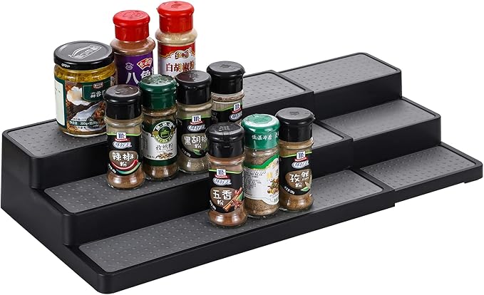 YCOCO 3-Tier Expandable Spice Rack Step Modern Design Waterproof and Non Skid Shelf Kitchen Organizer for Pantry Cabinet or Countertop Use,Black