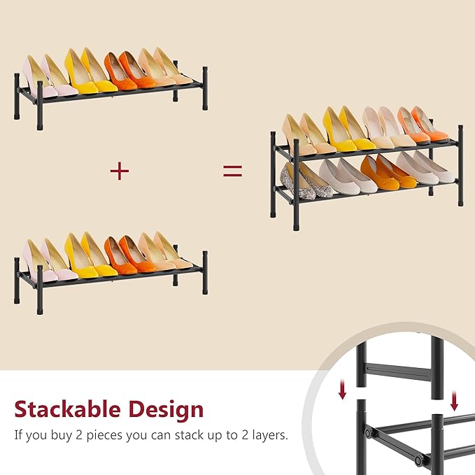 - 【Stackable Shoe Organizer】Multiple shoe racks can be stacked to maximize storage space within the same footprint. Purchase 2 or more shoe storage shelves to build vertical storage space. Weight capacity: 15 pounds per shelf.