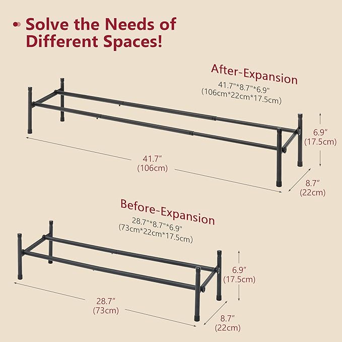 - 【Expandable Shoe Rack】The size of the shoe rack organizer can be expanded up to 28.74" to 41.73", so you can adjust it flexibly according to the size of the space and your need. Dimension: 28.74"~41.73" W x 8.66"D x 6.88"H.