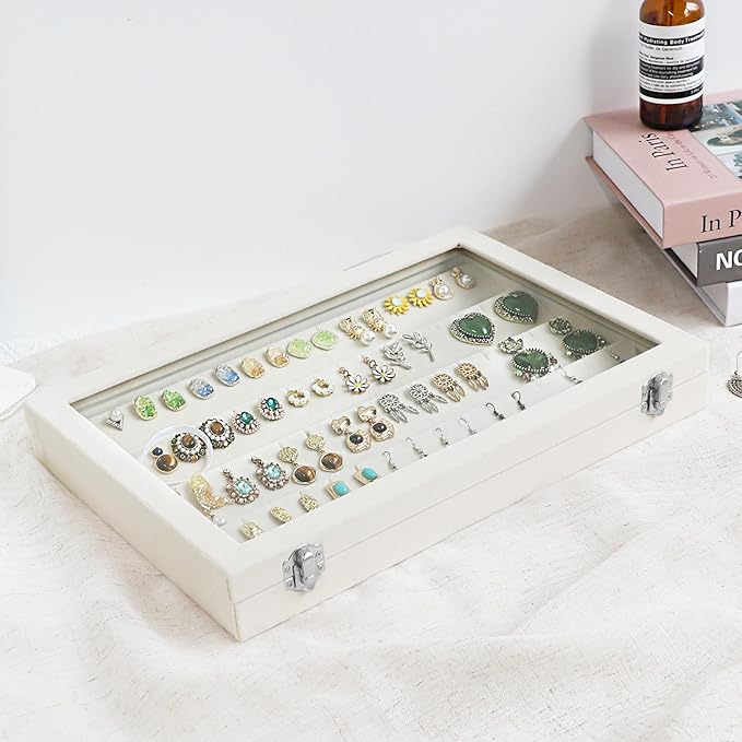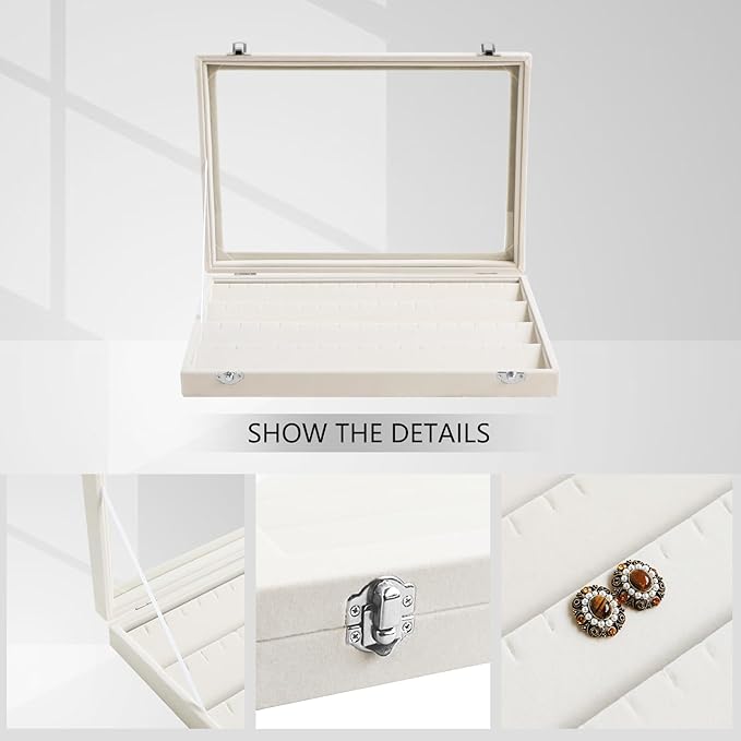 Wudygirl Jewelry Organizer Velvet Earring Organizer with Clear Lid 32 Pairs Earring Holder Jewelry Tray Display Case (Beige 64 Slot)