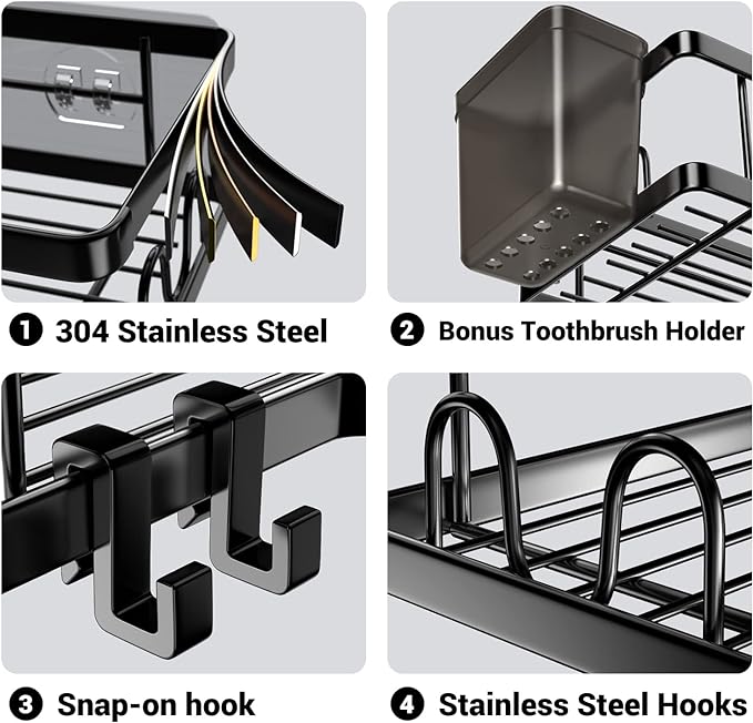 - [Premium Material & Package Contents]: Corner shower organizer is made of stainless steel, coated with rustproof paint and the solid frame wire is much more thickened than old version shower caddies. Package included: 2 x corner shower caddy, 4 x adhesive, 4 x plastic hook, 2 x toothpaste holder.