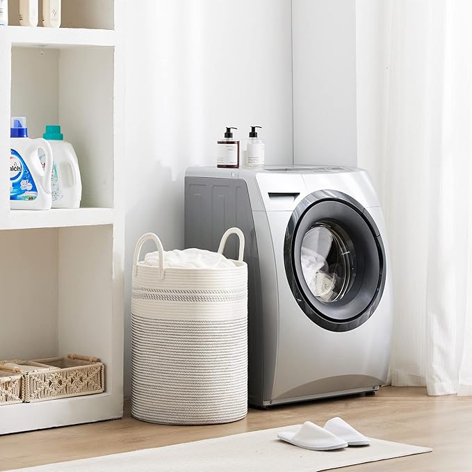 Fiona's magic 72L Large Woven Rope Laundry Hamper, Tall Laundry Basket Storage, Baby Nursery Hamper for Blankets, Toys and Clothes Hamper for Bedroom and Living Room Organizing, Jute, White