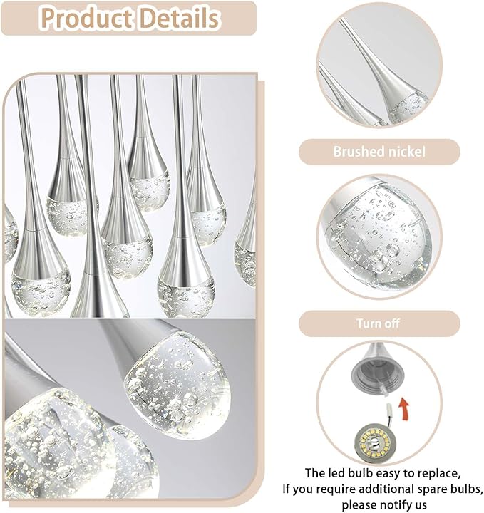 - Spiral Crystal Raindrop Ceiling Chandelier Design : Absolutely Beautiful. Elegant Style K9 Bubble Crystal and Hardware Pendant Light,in Addition to the Beautiful Shape,Ideal for Restaurants,Cafes,Living Rooms,Bedrooms, Kitchens or Any Place Where Creative Lights Are Needed.