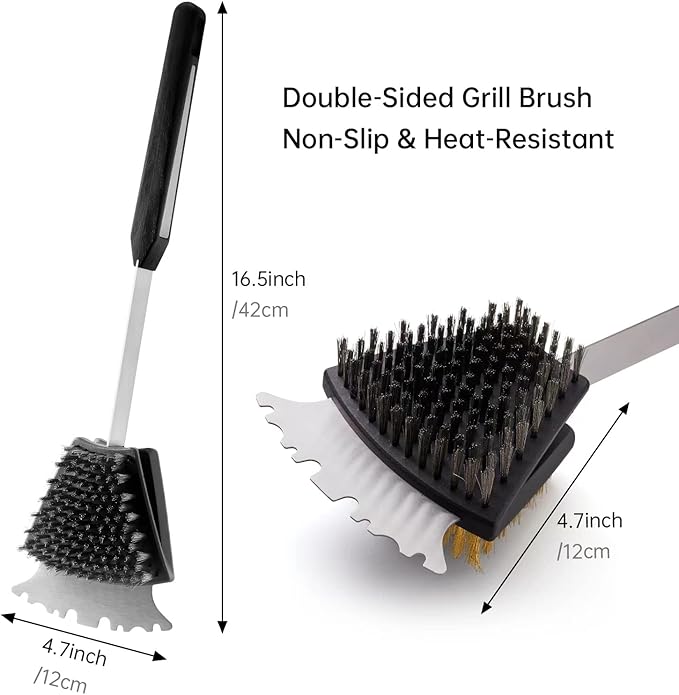Double Sided Grill Cleaning Brush and Scraper, 16.5" BBQ Brush, Barbecue Cleaner with Stainless & Brass Bristles, Grilling Grate Cleaner, Safe Grill Accessories for Cast Iron/Stainless Steel Grate