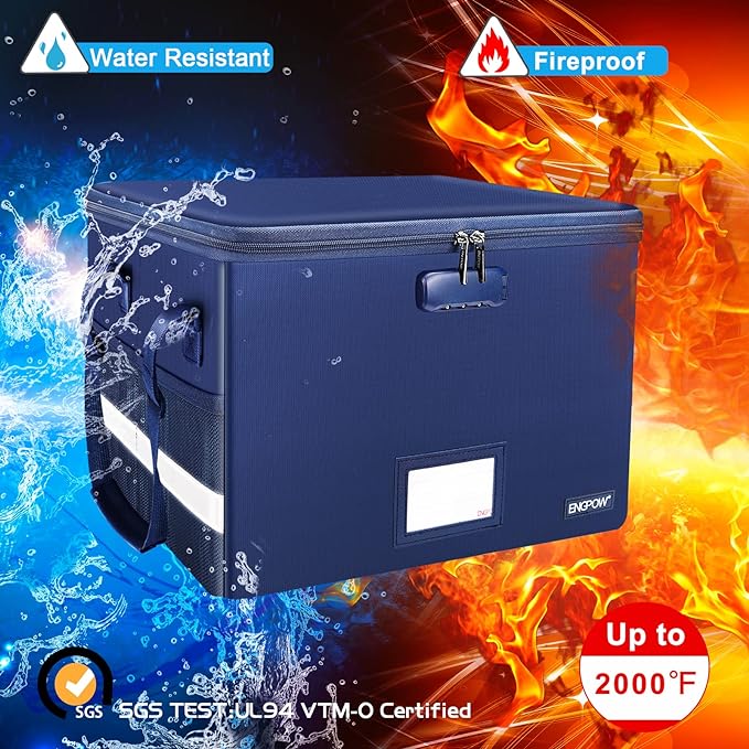 - Fireproof and water-resistant: Fireproof lock box is made of double layered non-itchy silicone coated fiberglass which stands up the temperature up to 2000℉.It has been passed by SGS TEST(UL94 VTM-0 Certified).Fireproof file box is not only fireproof but also high water resistant in case it gets wet for any reason.Nothing is completely foolproof, but added protection is always a good idea.