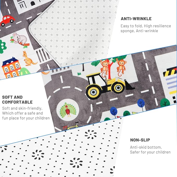 - EASY TO FOLD AND CARRY: Kids car rug is perfect for baby's playing, moving, crawling, and tummy time, Don't worry about the kids catching a cold when crawling on the cold floor. This kid's playmat is foldable and light to carry, perfect for playrooms, bedrooms, living rooms, etc.