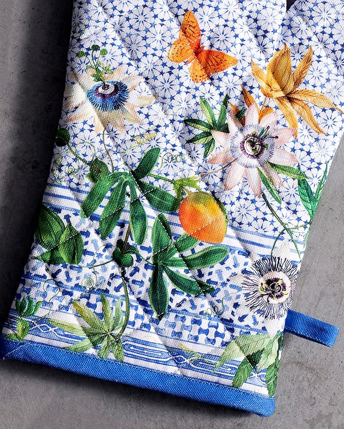 Maison d' Hermine 100% Cotton Oven Mitt & Pot Holder Set (7.5"x13" & 8"x8") Heat Resistant BBQ Cooking Gloves with Loop, Baking, Grilling, Kitchen, Handling Hot Pans Spring/Summer (Passiflora)