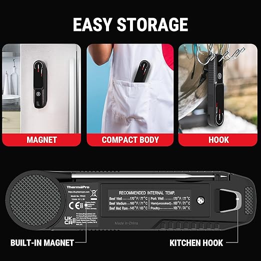 - 【Exquisite Design】Magnetic back, kitchen hook, and compact design make this digital meat thermometer easy to store and carry; Custom calibration ensures the accuracy of this meat probe can last forever; Fully waterproof feature allows this device to be safely cleaned under running water