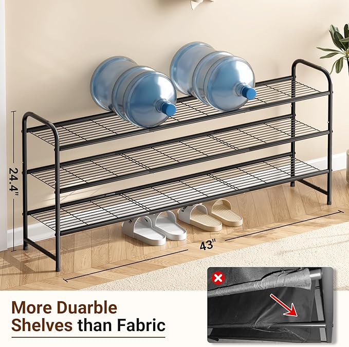 - 【Holds 24 Pairs of Shoes】 Longer 3 tiers shoe organizer for closet, can store 24 pairs of shoes, easy to hold up men's tennis shoes, sneakers, women boots, etc. The extra bottom space is enough to place daily wear flats, slippers. The large capacity shoe rack for entryway size is: 43"W x 11.4"D x 24.4"H;
