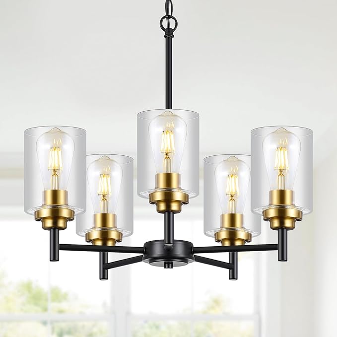 - ใ๐๐จ๐๐๐ซ๐ง ๐๐ง๐๐ฎ๐ฌ๐ญ๐ซ๐ข๐๐ฅ ๐๐๐ฌ๐ข๐ ๐งใBlack and gold chandelier combines metal and 5 clear glass shade which offers a signature focal point for various space. Gold accent on the light adds a luxurious contemporary glam to complement its farmhouse design. Definitely an eye-catching finish for your home lighting decor.