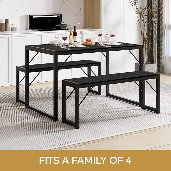 Gizoon 45.5" Dining Table Set for 4 with 2 Benches, Kitchen Table Set with Metal Frame & MDF Board, Space-Saving Dinette for Kitchen, Dining Room -Black