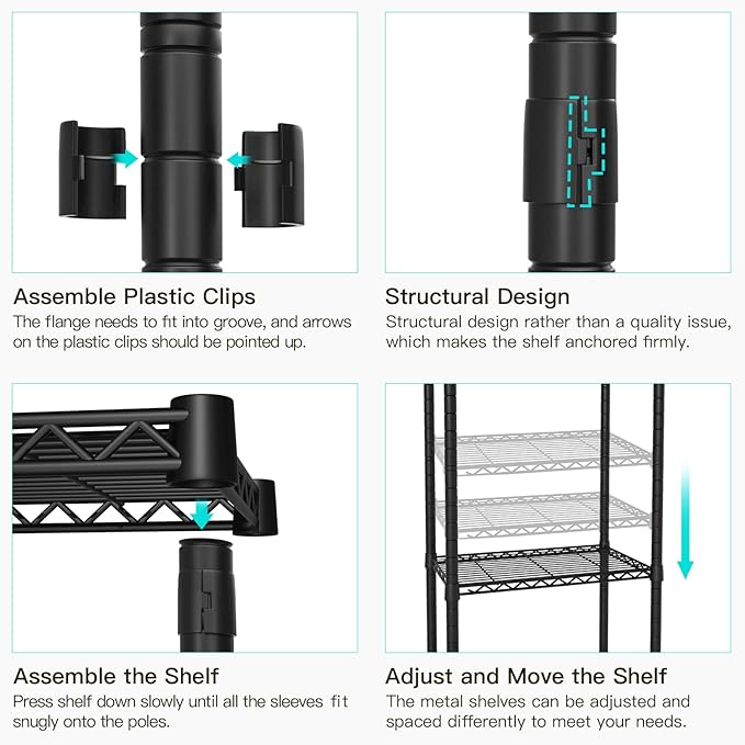 - ADJUSTABLE & DETACHABLE: When you install the plastic clips, aim at the inside flange of the plastic clip and the pole’s groove to make it assemble snugly. It will add stability and leveling to shelf installation. Due to the plastic clips and shelves are adjustable and detachable, it is flexible for each of the shelf installation position