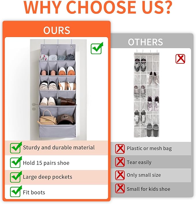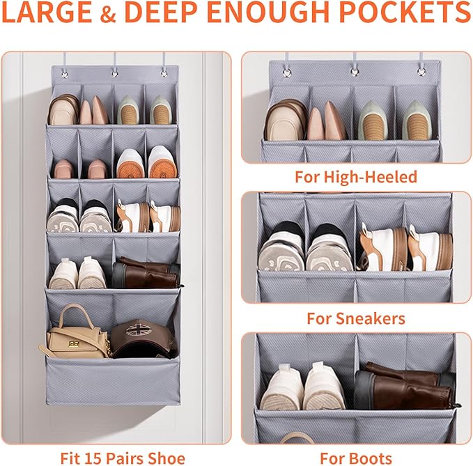 - Patent Pending, Large Deep Pockets & Large Storage Capacity: Fentec over The door shoe organizer make of sturdy oxford material. Hanging shoe rack with 15 pockets in different size can hold up to 15-18 pairs of shoes. It is a great home storage organizer, helps to increase more space for over door, closet and wall, making your room more tidy and clean.