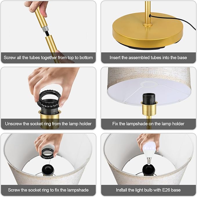 - 【Easy Assembly and premium quality】Made with a gold metal body and a linen lampshade, the vintage floor lamp is simply designed and look good in any surroundings; With a 6lb sturdy base, this 58-inch (5ft) in tall lamp stands steadily and won't tip over easily, which is safe for kids; Without tools required, you just need to screw all the parts together to finish the assembly of this standing lamp; PS. The assembly video is attached to the product page
