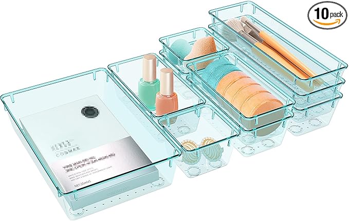 10 PCS Drawer Organizer Set, 4 Varied Size Bathroom and kitchen Drawer cabinet organizer Trays, Clear Storage Bins for Makeup, Jewelry, Utensils and Gadgets