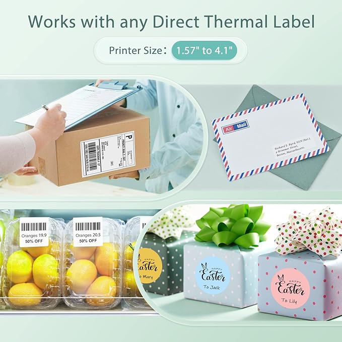 - Works with any Direct Thermal Label - This shipping label printer is not finicky with the brand of labels to save hundreds of dollars on label costs, and supports any direct thermal label including shipping labels, warehouse labels, barcode and ID labels, bulk mailing labels, address Labels, All-Purpose labels. The supported label width is from 1.57" to 4.1".