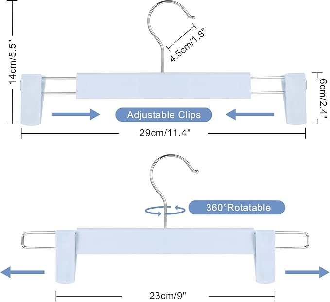 - 【Excellent design】: Our trousers hangers are very versatile, the stainless steel hooks can be rotated 360 degrees and can be hung in various positions, the hanger has removable clips at both ends, which can be adjusted from 21 cm to 28 cm, not only suitable for adult clothes, but also For children's clothing, in addition, the clips has a non-slip design, which can firmly hold your clothing and prevent it from falling