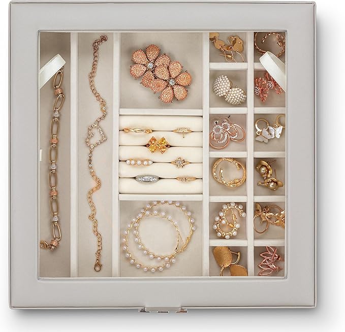 - COMPACT DESIGN: Designed to sit on your dresser without using too much precious space, this compact designed patented jewelry box comes with 2 trays, one on top of the other, the box measures 10.25 Inches wide 10.25 Inches in the length and 3.5 Inches in the height.