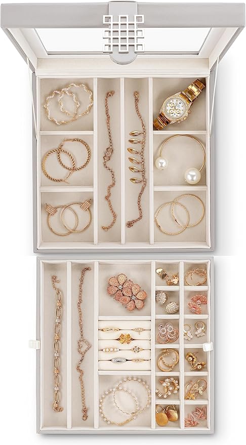Co 28 Section Jewelry Box - 2 Layer - Buckle Snap & Magnet Closure - Large Glass Top - Leather Design - Grey - Jewelry Organizer for Women & Girls - for Earring Ring Necklace & Bracelet