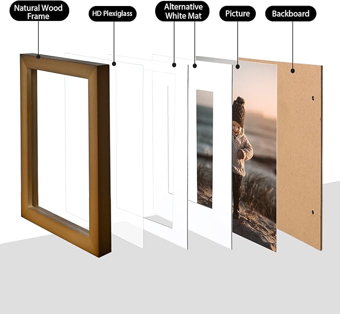 - SOLID WOOD: Kinlink 5x7 photo frames are fitting for standard pictures 3.5x5/4x6 with mat and standard pictures 5x7 without mat. These 5x7 frames matted 4x6 are made of light weight solid wood, with transparent, non-toxic acrylic glass front that gives a clear view of your pictures and preserves your precious memories as well. It is worth noticing that remove the protective film on the glass before use.