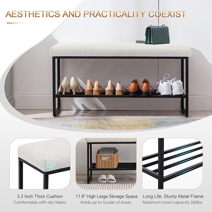 Zesthouse Upholstered Shoe Bench Entryway with Storage, Comfy Line Fabric Bench for Bedroom End of Bed, Metal Shoe Rack for Closet Hallway Doorway Living Room Mudroom, Beige