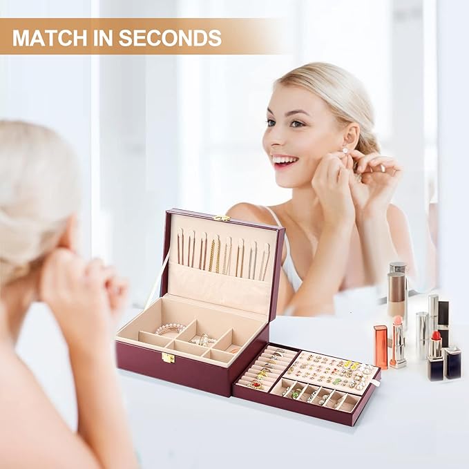- 💎【Find the Perfect Match Instantly】: Get your jewelry neatly and beautifully stored in this jewelry boxes organizers. No more messy, damage or misplace. keep your jewelry orderly organized and find your favorite accessories quickly. No more struggling to find where your matching pieces are everyday. Gets your daily dressing up quicker and easier.