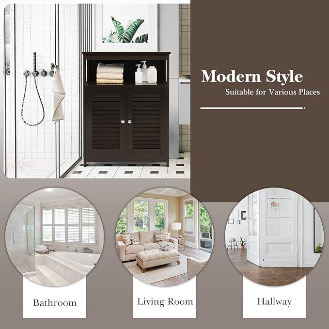 - 【Considerate Details】1. Adjustable internal shelf with three different positions designed for various storage demands. 2. Double shutter doors allow maximum air circulation in the floor cabinet for better keeping your items. 3. Elevated feet parts stop dust or water from entering into the storage cabinet for long-term use. 4. Elevated edges in the middle shelf prevent things from falling. 5. Details instruction included makes installation a breeze.