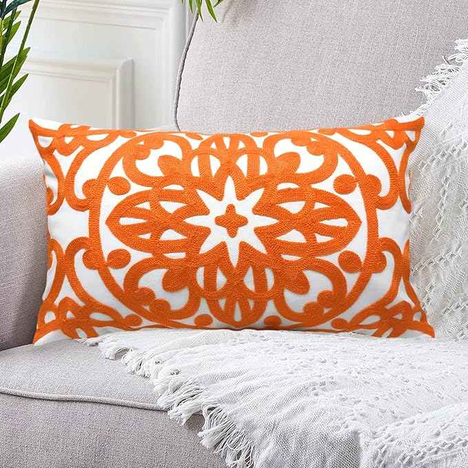 Alysheer Embroidered Lumbar Decorative Throw Pillow Cover 12"x 20", Classic Boho Mandala Embroidery Pattern Cotton Rectangular Cushion Case for Sofa Couch Living Room Bedroom (Bright Orange)
