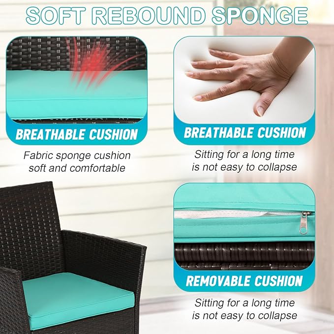 • ♬【STRONG & STURDY】-This patio furniture set is made with a powder-coated steel frame and all-weather PE rattan wicker for a comfortable experience.The wicker of the Outdoor furniture set is sturdy but also very light. The seat cushion of this patio Conversation Set can be removed for easy cleaning.