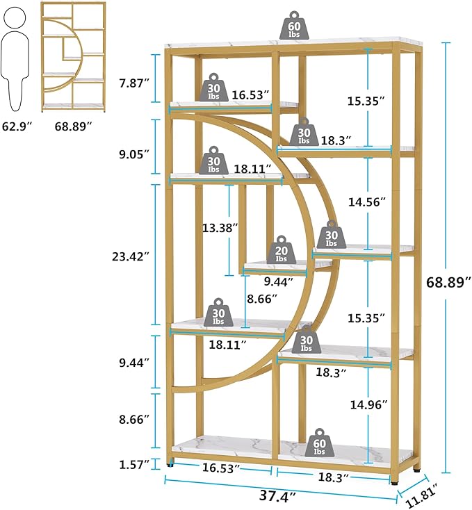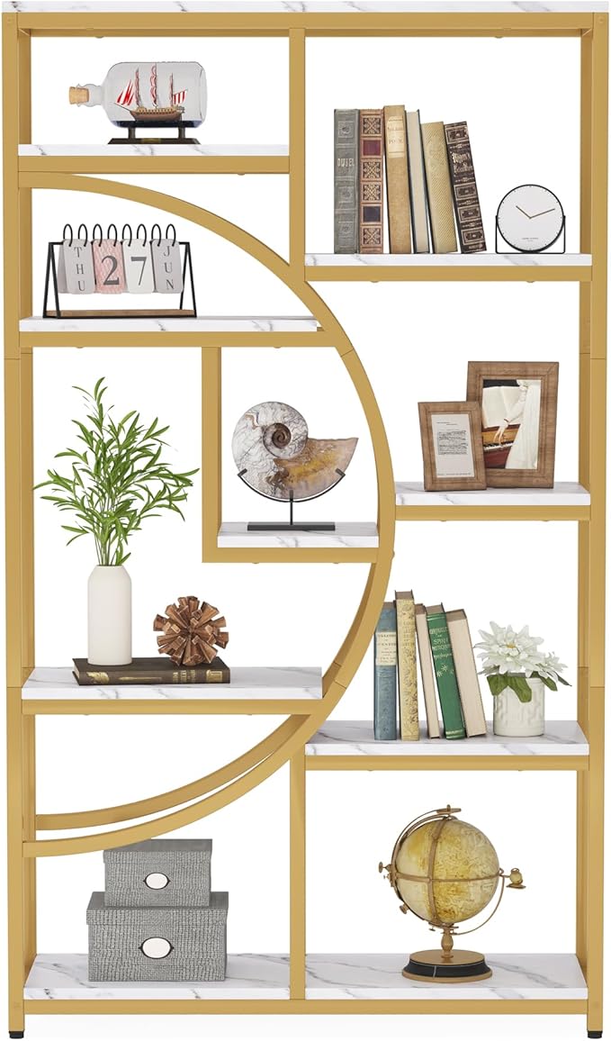 - Elegant Geometric Design: Crafted with gold metal frame and white marbiling board, this bookcase with its half-moon silhouette design brings sophisticated flair to your favorite aesthetic. Fill the bookshelf with books, photos, plants and decorations to make it an eye-catching of your home