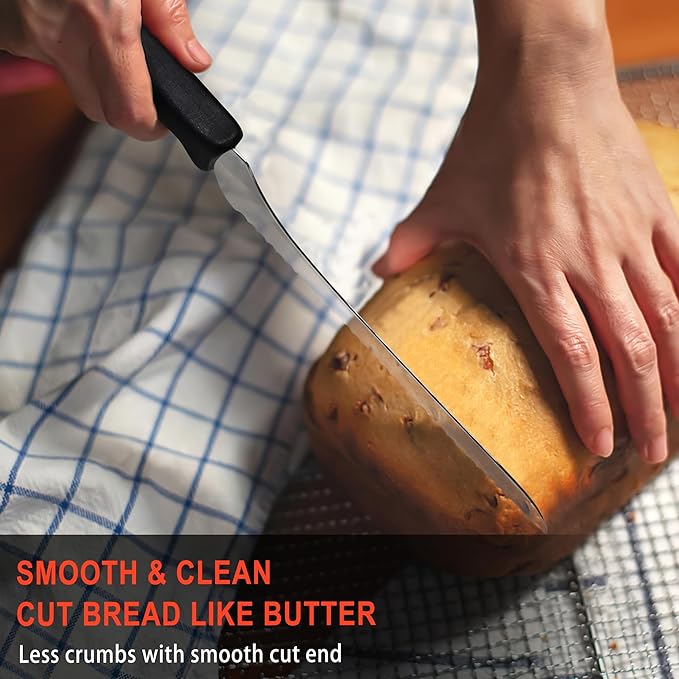 - CUTSBREAD LIKE BUTTER: Super sharp serrated edges, It cuts smoothly with little resistance and does not need to be sawed back and forth too many times. And the bread is not covered with crumbs. The teeth on the wavy blade easily cut through the outer shell or skin of the food without tearing through the soft interior.