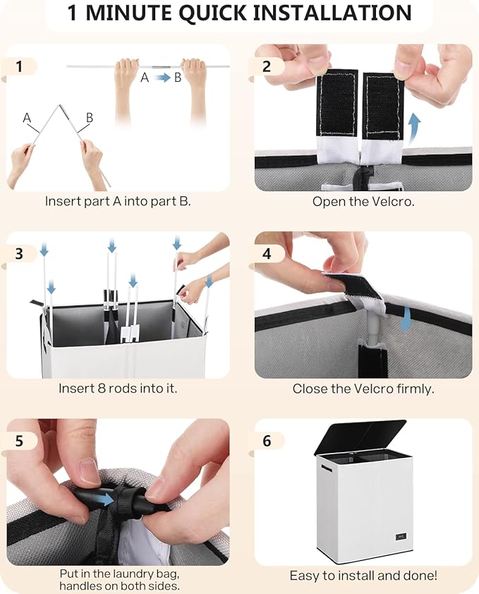 - 【Easy to Install and Foldable】This clothes basket with detailed installation instructions, just insert 8 support rods into the fixed tube, you can complete the collapsible laundry basket installation in 2 minutes, which is simple and convenient. In addition, it can be folded up and stored in a cabinet when idle, reducing the space occupation
