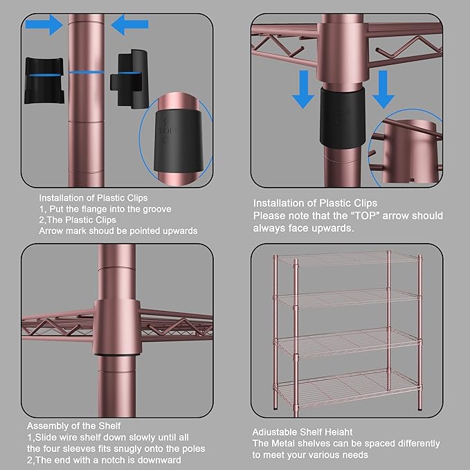- 【Easy to Assemble】A rubber mallet is recommended, but it's not included. Just be sure to read the assembly directions carefully BEFORE you start putting it together. Certain shelves must be installed in a particular order,the position of the shelf assembly can be adjusted according to your needs. Moreover, the height can be adjusted with a slip-sleeve locking system by increments of 1 inch each time.just adjust the leveling feet, the storage rack can be placed on uneven ground.