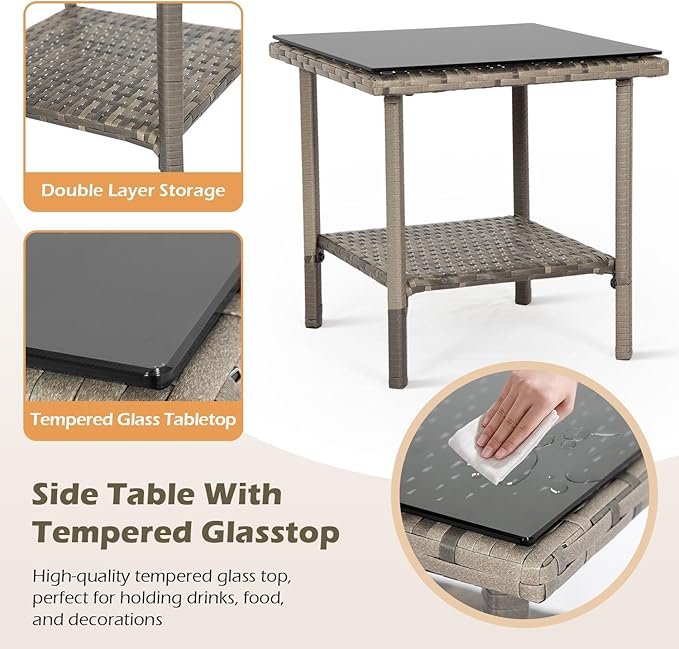 - ♬【SIMPLE & ELEGANT】-Outdoor set features and elegant glass top side table perfect for a couple glasses of wine or the morning coffee and newspaper.The patio set is simple and stylish,it will be perfect for decorating your yard, poolside, balcony, patio and home.Rattan Chair Dimension: L23" x D23" X H33,Table Dimension: L16"xW16"xH16”.