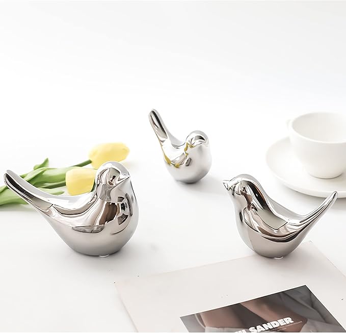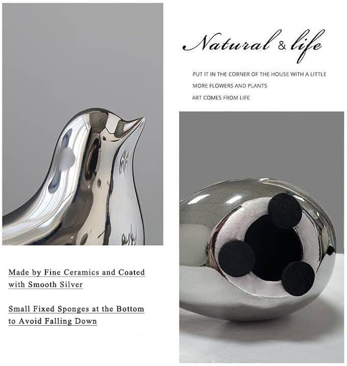 - The Bird Figurine is handmade of quality ceramics and coated with a layer of silver. It is shiny, smooth and sturdy, but easy to get scratched. Please handle fragile items with care. Please understand that the color of little bird may vary due to different lights and screens.