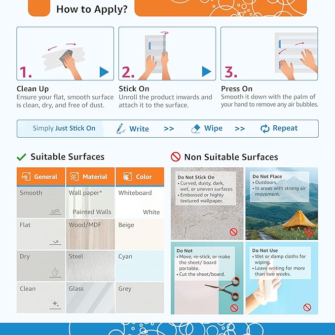 - EASILY STICKS TO ANY SURFACE: This clear white board adheres to walls, whiteboard for kids, wood, glass, and steel using electrostatic charge—no adhesive needed. Leaves no residue or damage, making it an excellent addition to homeschool supplies and classrooms.