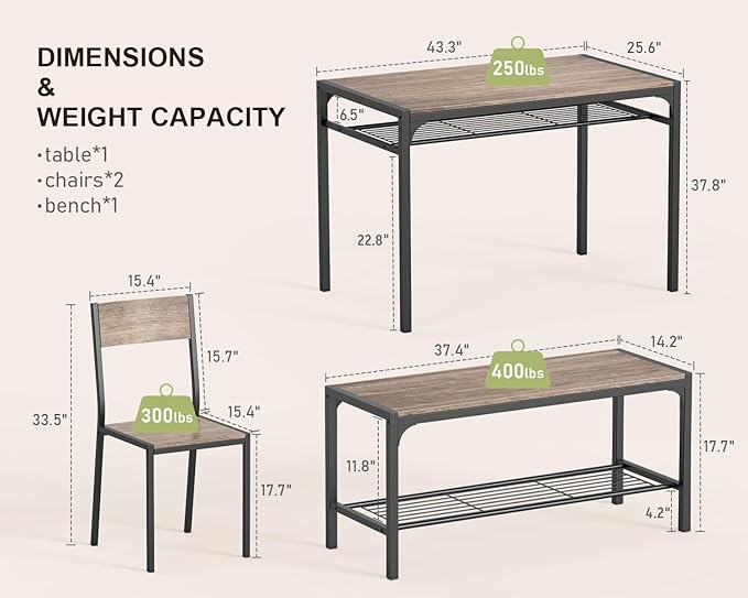 - Product Specifications: Table Dimensions: 43.3" x 25.6" x 30"; Weight Capacity: 250 lbs Chair Dimensions: 15.4" x 15.4" x 33.5"; Weight Capacity: 300 lbs each Bench Dimensions: 37.4" x 14.2" x 17.7"; Weight Capacity: 400 lbs Package Includes: 1 table, 2 chairs, and 1 bench