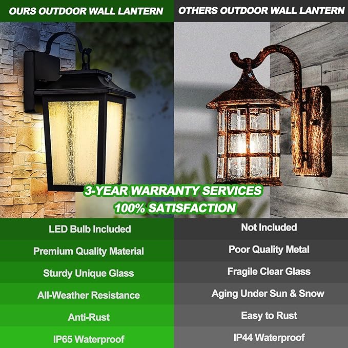 - 【Weather Resistant & Rustproof】Specially designed for outdoor, the outdoor led wall lantern is made of top-quality materials and adopts the die-casting process to effectively prevent rust and corrosion. Even in extreme weather, the pairs of dusk to dawn outside light can still be trusted for their quality and stability. The close fit of the precision-cut glass and premium frame creates a sturdy structure. The exterior light fixture has passed the strict IP65 waterproof test.