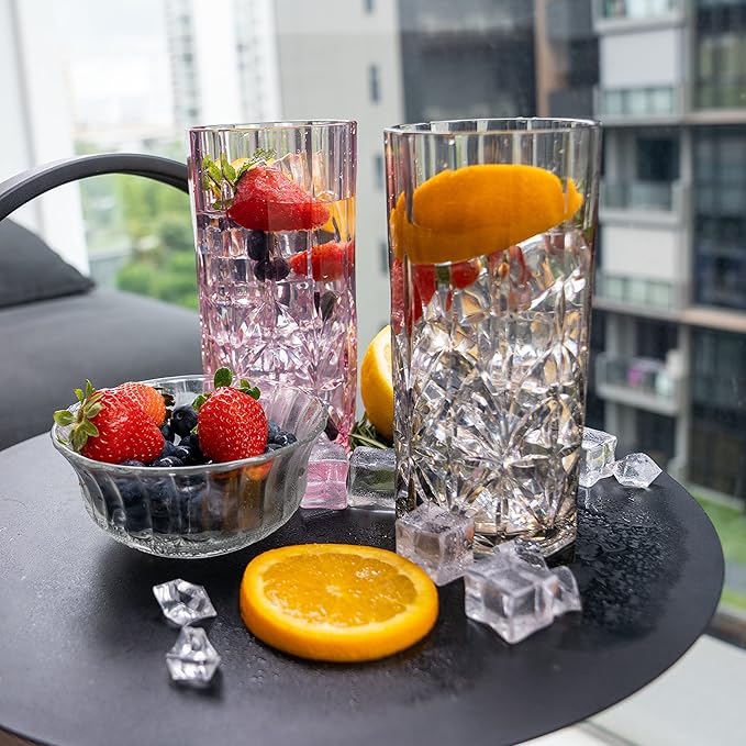- Elegant Crystal Cut Glasses for the Modern Host: Sturdy and elegant, the classy Myrtle Beach tall plastic drinking glasses from Bellaforte can easily steal the show at any party. With a capacity of 18 oz, our glasses are great for beverages like cocktails, juices, teas and smoothies