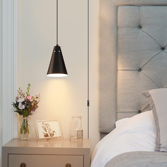 Black Plug In Pendant Light,Hanging Lights With Plug In Cord On/Off Switch, Mini Pendant Lights for Kitchen Island,Modern Farmhouse Pendant Light Fixture with Metal Shade,Hanging Lamps for Bedroom