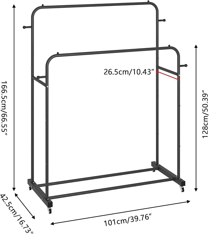 Laiensia Double Rods Garment Rack with Wheels, Clothing Rack for Hanging Clothes,4 Hooks, Multi-functional Bedroom Clothes Rack, Black