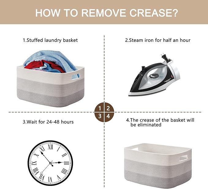 - Washable Large Basket: This large basket can be washed by hand or machine with gentle detergent. If machine washed, please put them into a laundry bag. NOTE: These cotton rope baskets are folded when shipping, but it will turn back to its elegant shape quickly if you fill it with some towels or clothing, and iron is great idea to remove the creases