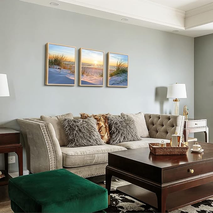 Natural Wood Framed Wall Art for Living Room and Bedroom - Large Size Sun Blue Beach Pictures - Office and Home Decor - Ocean Paintings Set of 3 Piece Framed Art Prints