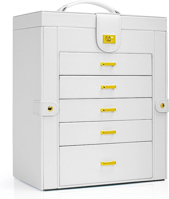 - LARGE CAPACITY: With 6 versatile pull out drawers, this white jewelry box can store a lot of jewelry accessories, such as rings, earrings, necklaces, chains, bracelets, and so on. Soft pillows in the bottom drawer suit for storing watches. One deeper drawer is designed for sunglasses or large jewelries