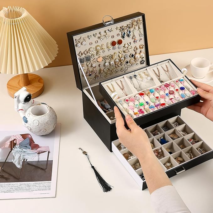 - 【 3-layer large capacity 】 : The large jewelry storage box has 28 ring slots, 13 ring boxes, 15 necklace hooks, 98 stud holes. When you pick up the middle plate, you will find 6 detachable slots hidden under a large compartment, which can place the jewelry you want to place. With a variety of designs and compartments, this jewelry organizer can store all of your jewelry, from large pieces to small earrings, with a place to store it.