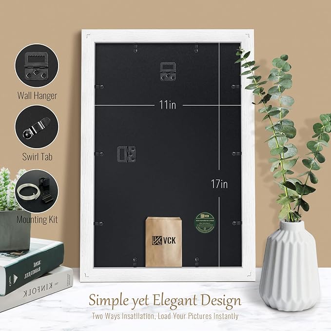 - PRODUCT FEATURES: The overall size is 18.8”x12.8” for Pictures 11x17 or 17x11, horizontal/vertical for table or wall display. Unlike others, special swirl tabs make the frame super easy to load pictures.