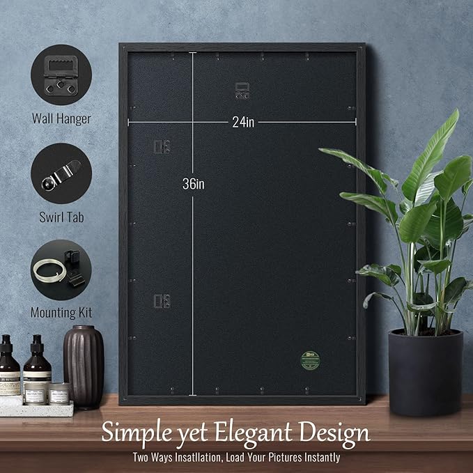 - PRODUCT FEATURES: The overall size is 37.8”x25.8” for Pictures 24x36 or 36x24, horizontal/vertical for table or wall display. Unlike others, special swirl tabs make the frame super easy to load pictures.